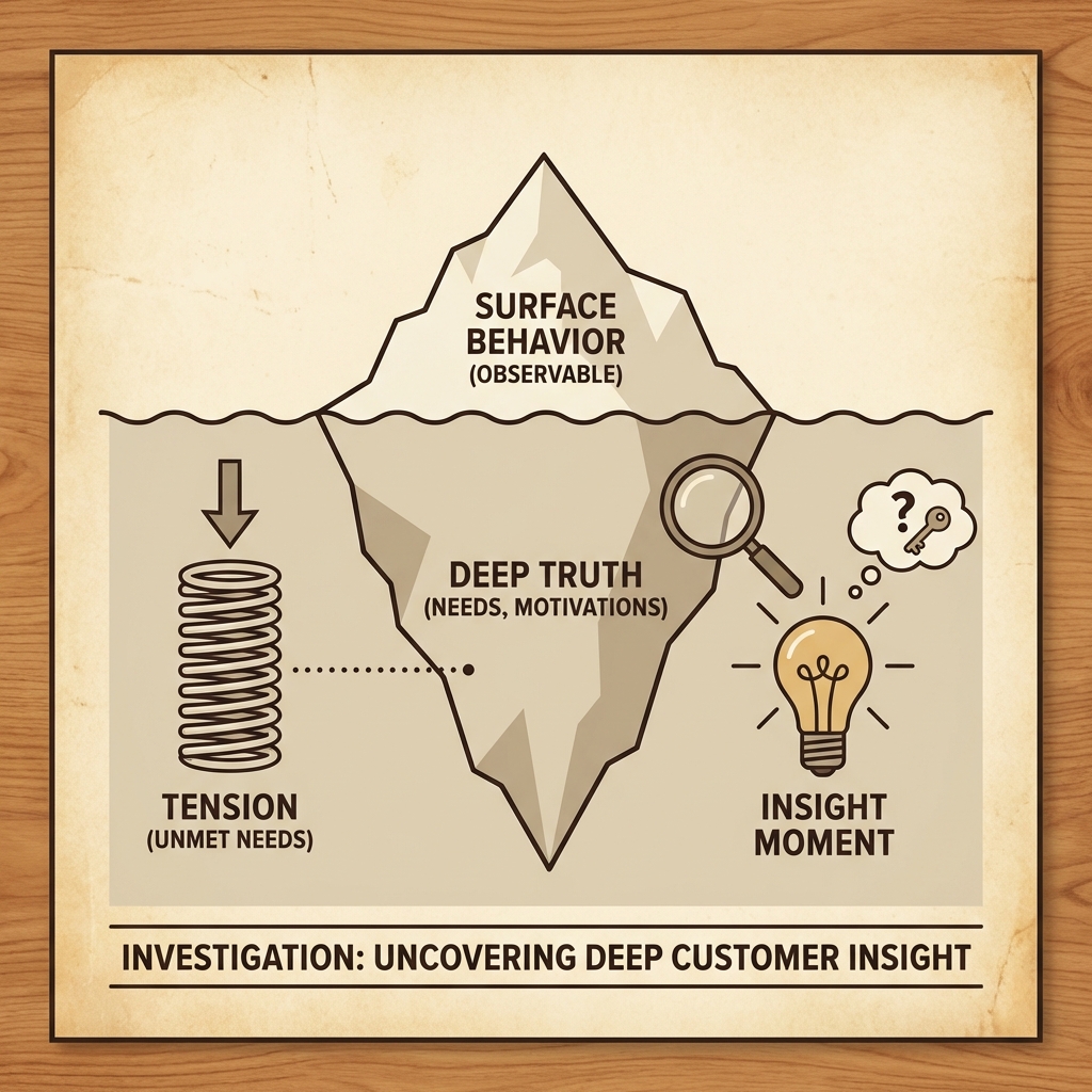 Insight không phải là data hay observation (quan sát). Insight là lý do "Why" (tại sao) ẩn sâu bên dưới hành vi, thường chứa đựng một mâu thuẫn hoặc một sự thật hiển nhiên nhưng bị bỏ qua.