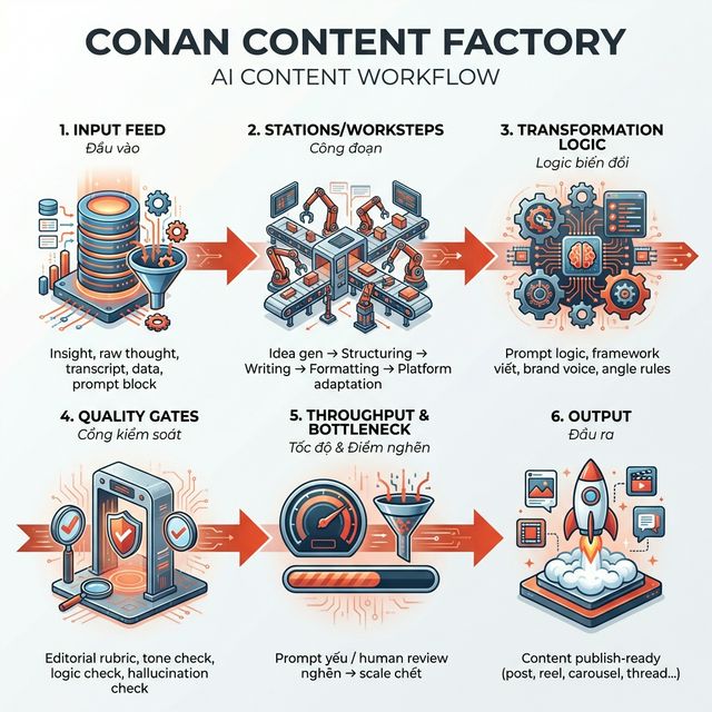 VinFast cần linh kiện đạt chuẩn, Thanh Niên cần tin đã verify, Conan cần prompt block có cấu trúc. Không có input chuẩn = không có production line.